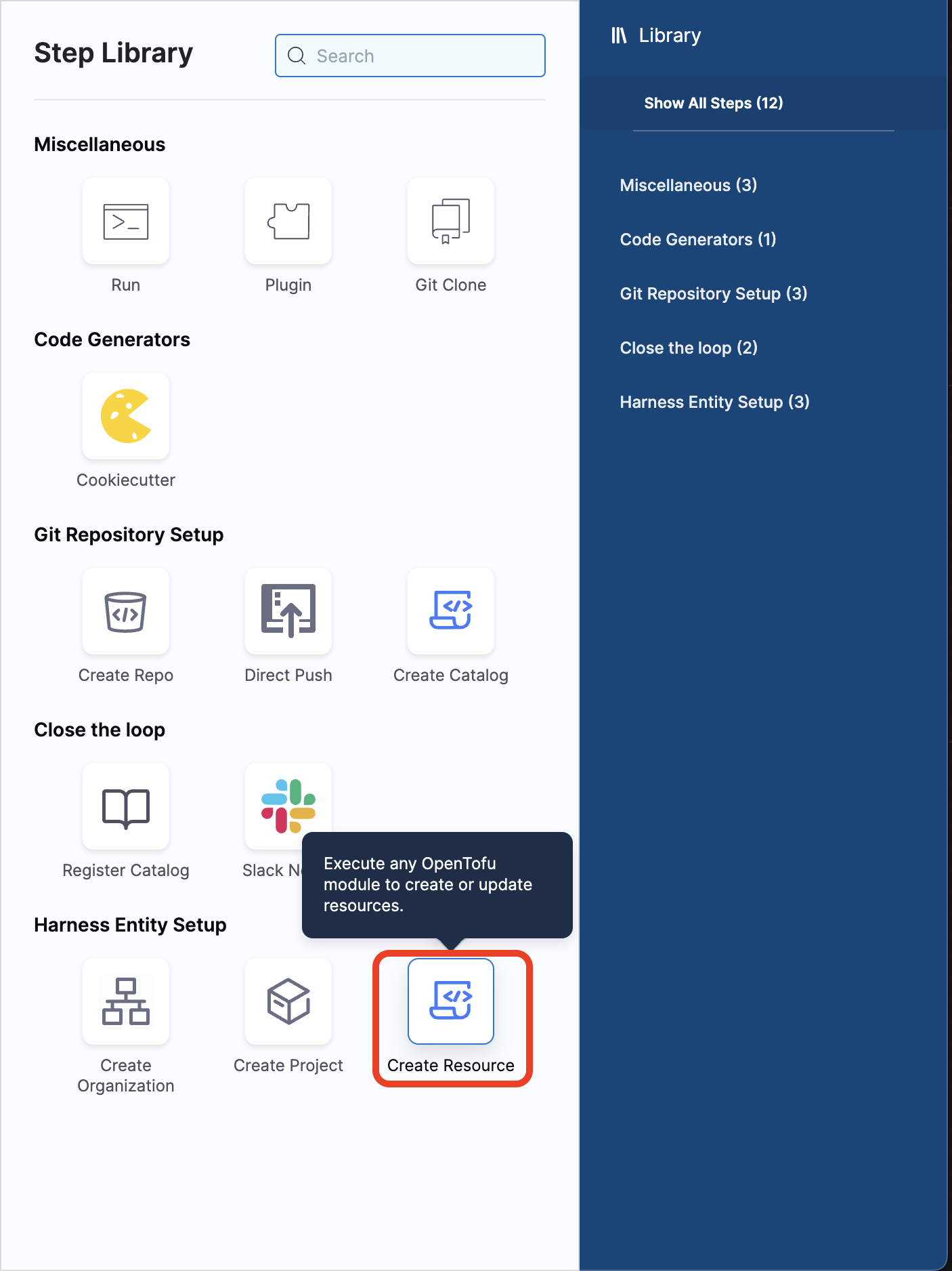Harness IDP includes a native IDP Stage where all IDP-specific tasks required for pipeline execution are pre-configured as pipeline steps within the stage. This enables quick and efficient creation of self-service workflows.