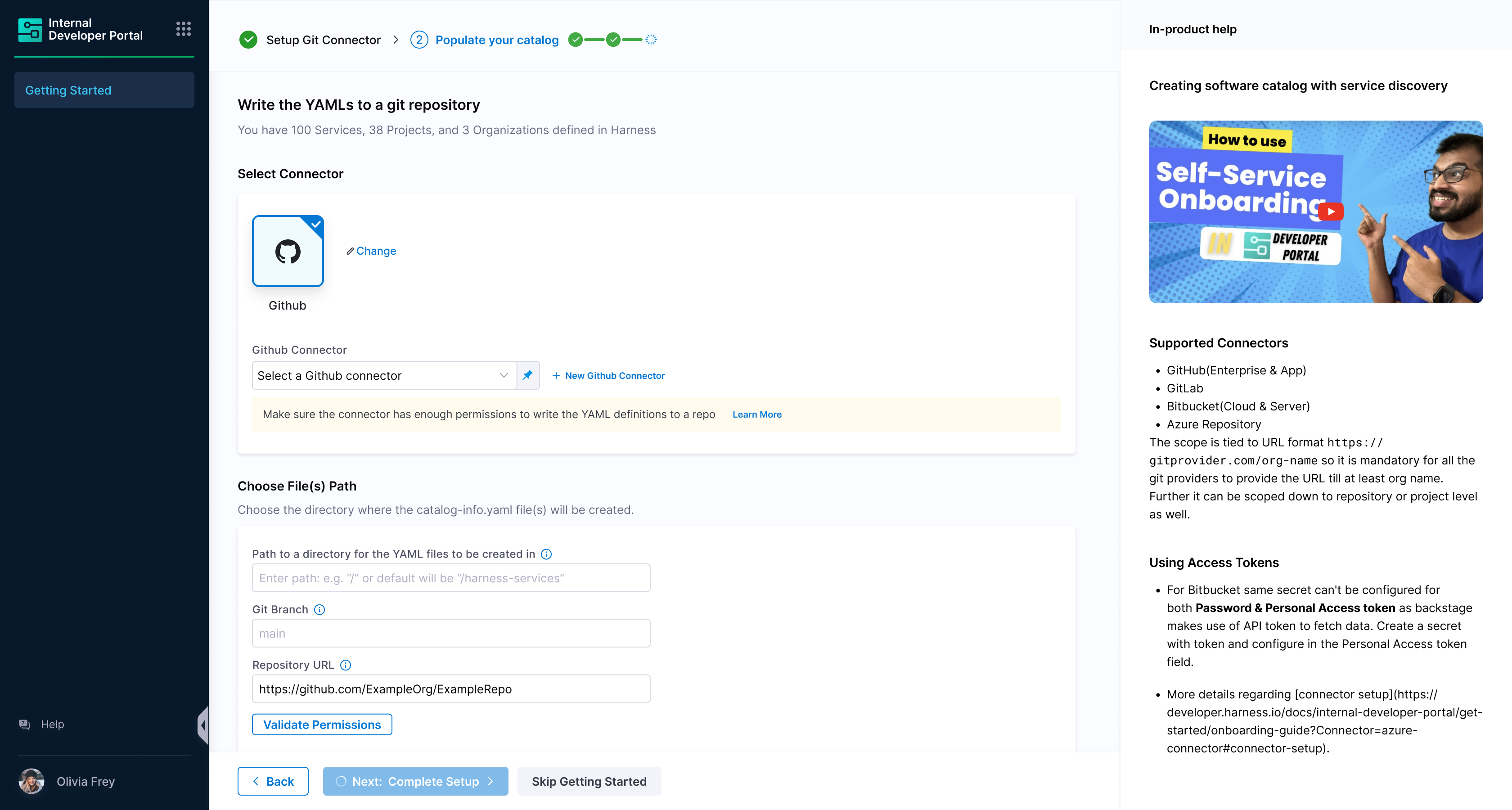 The software components in IDP are defined using YAML files, which are typically stored in your git repositories hence configuring a connector for these git providers is essential to fetch and manage these YAML files.